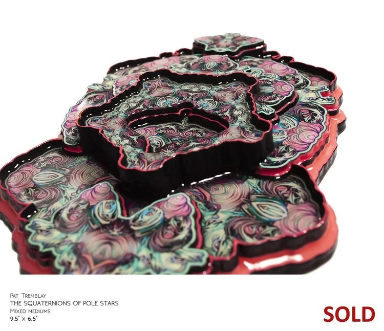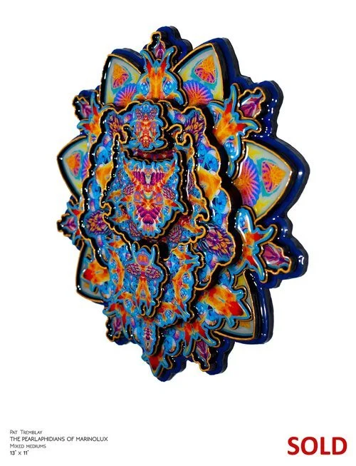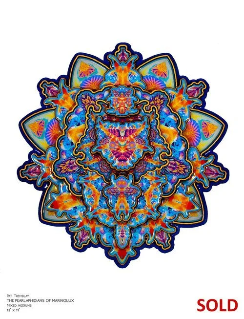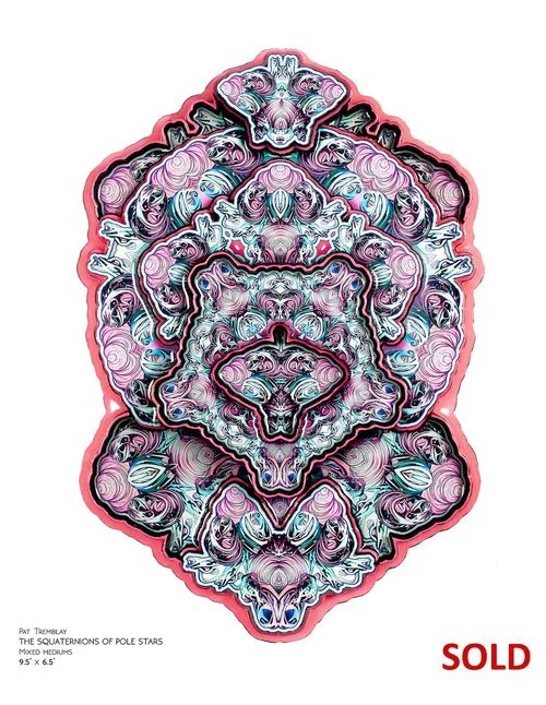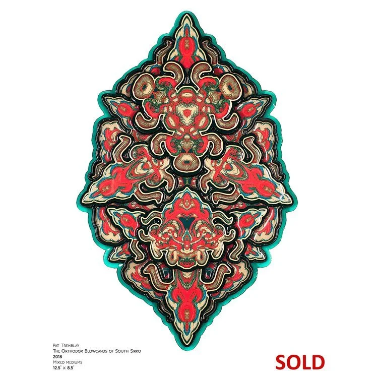 This collection was first based on collages made from various but specific groups of elements such as mushrooms, church architecture, marine life, while others purely originated from abstract digital paintings made specifically for this project. Through selected kaleidoscopic manipulations and extensive coloring explorations, I then reassembled them into tridimensional constructions with totem-like structures or imbricated facial ensembles, all of which offer a visually varied interpretation that can be seen as much in detail as in an overall view.